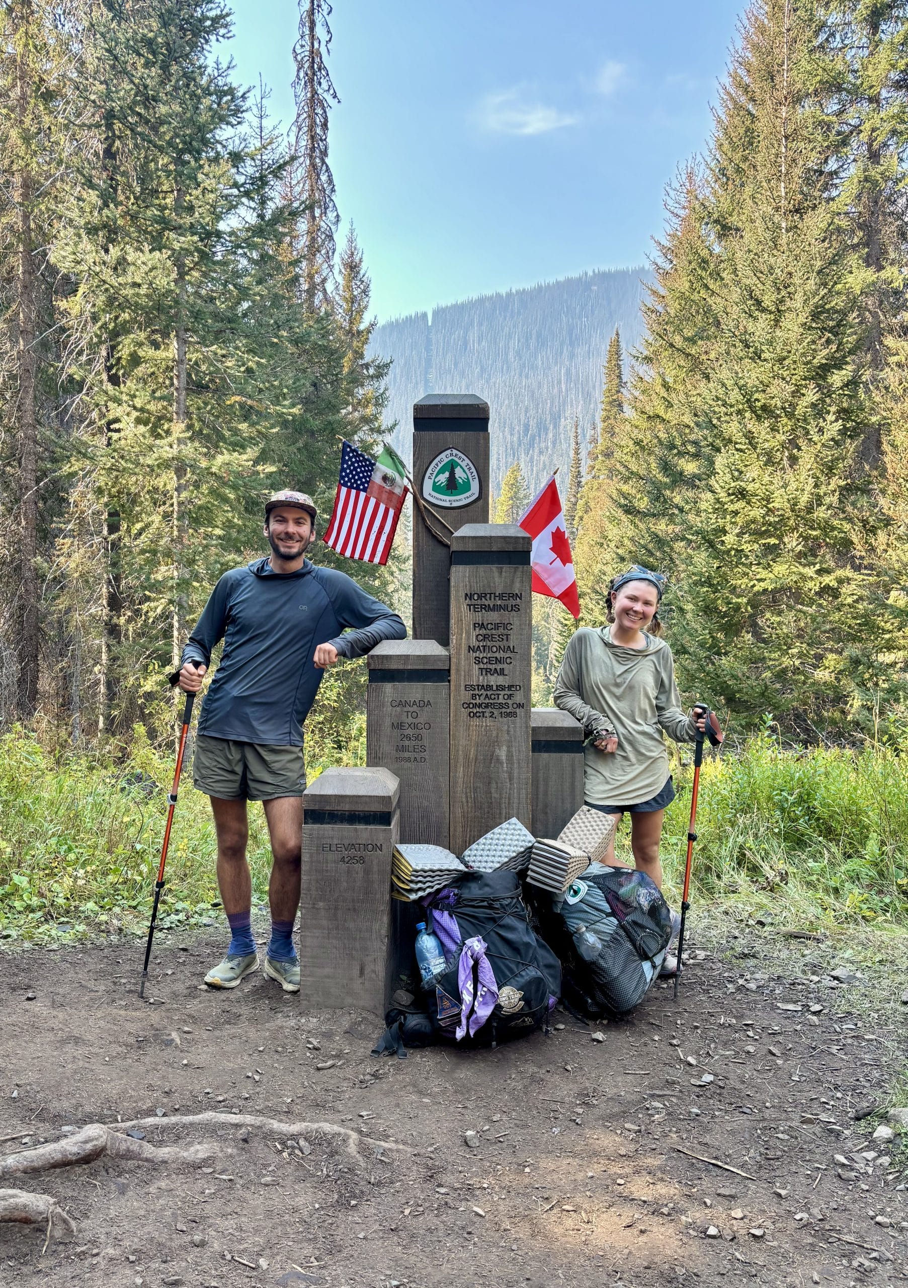 After resupplying in Portland, Emily and I continued our trek across the Columbia River and into the Evergreen State. The terrain was reminiscent of the Sierra, with steep ascents and heavy packs. After a few days, we were greeted by intense smoke, and began to worry that our luck involving fire closures was wearing out. After getting into town, we learned that the fire was ahead of us, but we would need to skip around Mt. Rainer in order to avoid it. Although we were bummed about skipping a beautiful section of trail, we were happy to be out of the smoke and continuing our hike. The last week of the trail had its way of telling us the end was near; drenching rain and colorful foliage meant our summer was coming to an end. On September 19th, we reached the Canadian Border after hiking for 115 days and over 2,200 miles. Although the terminus was full of many groups of people, there was an overwhelming silence from all. I really couldn’t tell you what it felt like sitting there; completing a life long goal like this that seemed so far out of reach left me in disbelief that we’d accomplished it.